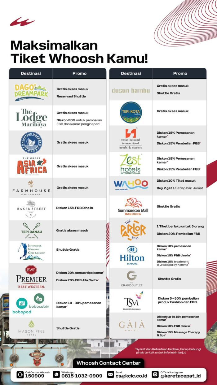 Berikut adalah 23 destinasi mitra dalam program promo libur sekolah Whoosh cukup dengan menunjukkan Tiket Whoosh: