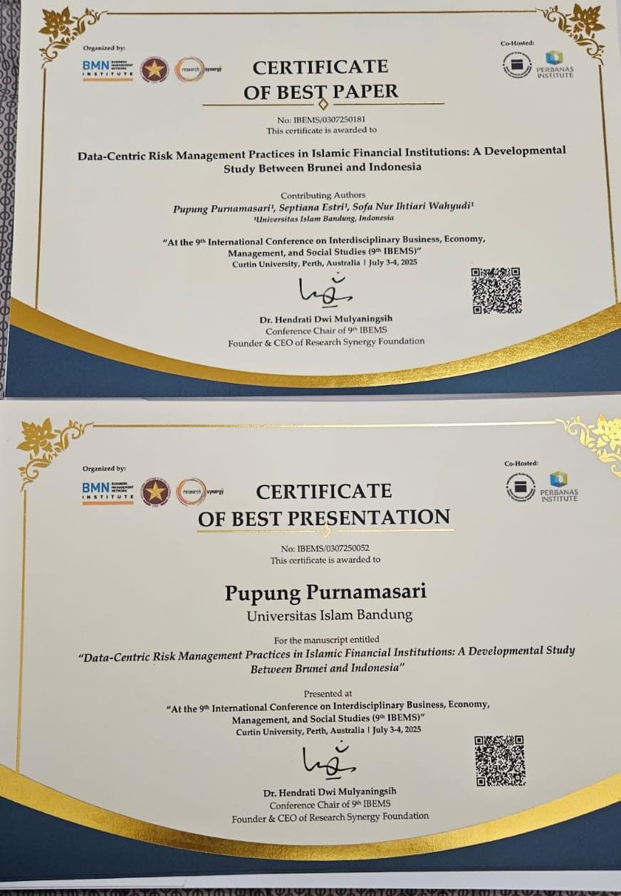 BERITAUNGGULAN.COM, BANDUNG (KOMHUMAS) — Prestasi membanggakan kembali ditorehkan oleh Program Studi Magister Akuntansi Fakultas Ekonomi dan Bisnis Universitas Islam Bandung (FEB Unisba). Prof. Dr. Pupung Purnamasari, S.E., M.Si., Ak., CA., dosen Program Studi Magister Akuntansi FEB Unisba sekaligus Ketua Program Studi Magister Akuntansi FEB Unisba, berhasil meraih dua penghargaan bergengsi sekaligus, yaitu Best Paper dan Best Presenter dalam ajang 9th International Conference on Interdisciplinary Business, Economy, Management, and Social Studies (IBEMS) yang digelar di Curtin University, Perth, Australia, pada 3–4 Juli 2025.