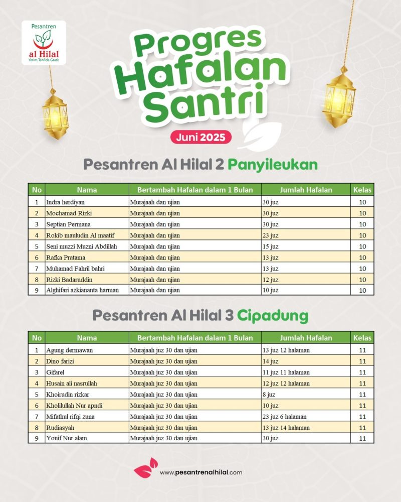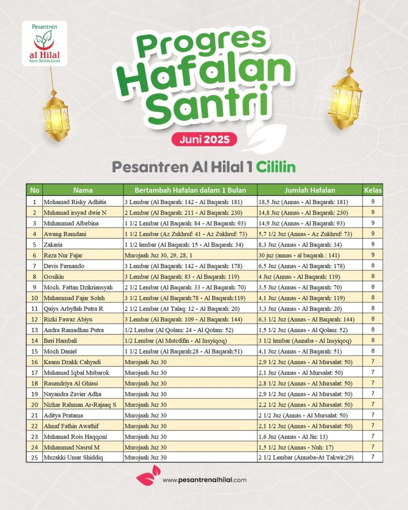Sejak awal masuk Pesantren Al Hilal, para santri mulai melaksanakan program Hafidz Qur’an sesuai dengan ketentuan yang berlaku. Kegiatan menghafal, menyetor hafalan dan muroja’ah hafalan menjadi kegiatan rutin yang terbiasa dilakukan bagi setiap santri dimana pun dan kapan pun. Hingga pada bulan Juni 2025 ini, setiap santri Pesantren Al Hilal menunjukkan progres hafalan yang membanggakan.