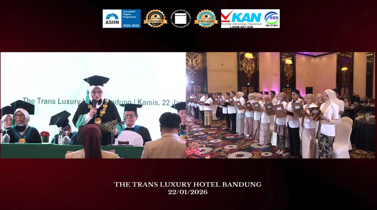 BERITAUNGGULAN.COM, BANDUNG — Dokter-dokter baru kembali dilahirkan Fakultas Kedokteran Universitas Islam Bandung (FK Unisba) melalui prosesi Yudisium dan Pengambilan Sumpah Dokter Gelombang 2 Tahun Akademik 2025/2026 yang diselenggarakan pada Kamis (22/1/2026), bertempat di Trans Convention Centre, Jalan Gatot Subroto Nomor 289, Bandung.
