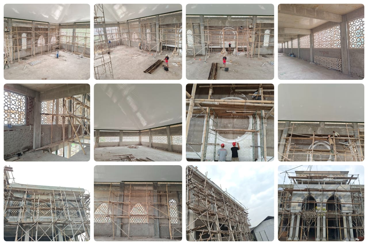 Sementara itu, pembangunan di lantai 3 terus berlanjut dengan pemasangan ornamen kerawangan, plester aci pada area Mihrob bagian luar, plester dinding area kerawangan bagian luar, serta plester dinding talang di bagian depan. Seluruh proses ini diharapkan dapat berjalan lancar demi terwujudnya Masjid yang kokoh dan nyaman untuk para jamaah.